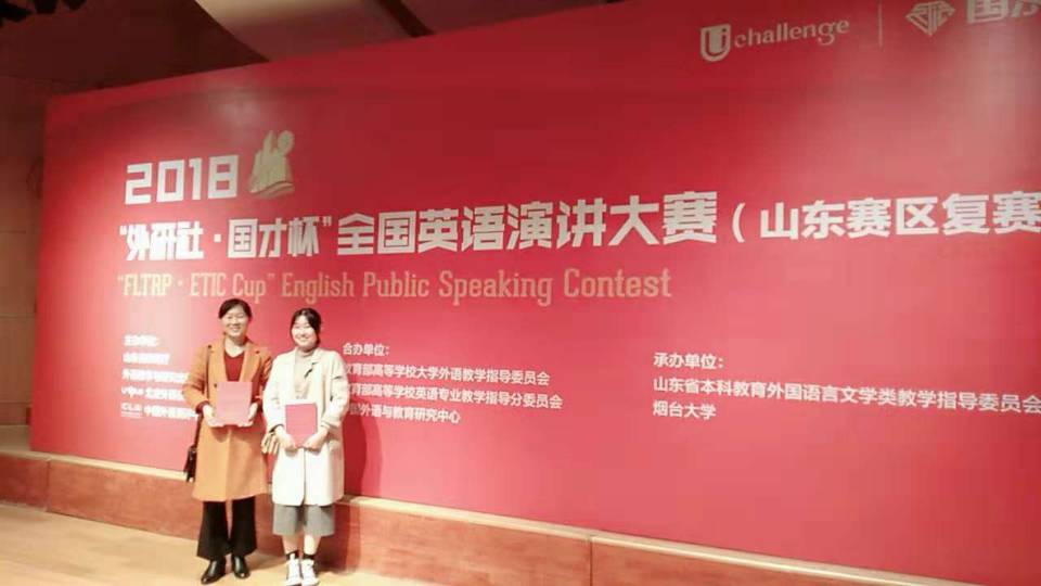 “外研社·国才杯”全国英语演讲大赛作为我国外语界规模最大,影响最广,最具权威的赛事,由山东省教育厅、外语教学与研究出版社主办,教育部高等学校大学外语教学指导委员会和教育部高等学校英语专业教学指导分委员会合办,在2017年2月被纳入中国高校创新人才培养暨学科竞赛评估项目,为国内最具广泛影响力的竞赛项目之一,也是唯一被纳入的英语类竞赛。对于此次高水平赛事,学院领导给予高度重视和全力支持,经过层层选拔,最终确定了刘蕾同学代表我院参赛,由咸静老师指导。期间经过耐心、严格的训练,从演讲稿到演讲技巧等环节进行了充分的准备。此外,英语教研部全体老师在比赛前对刘蕾同学进行了专项模拟训练。本届山东赛区复赛,要求选手在3分钟内完成定题演讲和即兴演讲,并有1分钟的时间回答评委提出的问题,充分考察了学生的语言功底,应变能力和知识结构。我院刘蕾同学在定题演讲中,以自己创业案例为出发点,结合自己的大学学习生活经历,阐述了坚持对于大学生创业成功的重要性,在随后的即兴演讲和评委问答环节中,刘蕾同学更是以娴熟的语言基本功和优雅的台风征服了现场评委,最终获得了三等奖的好成绩。