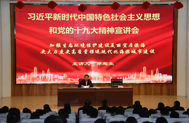 1月9日下午,学院请来市委常委、政法委书记孙起生在图书馆报告厅为同学们宣讲习近平新时代中国特色社会主义思想和党的十九大精神。孙起生书记以《加强生态环境保护建设美丽宜居滨海更大力度更高质量推进现代化海滨城市建设》为题,详细阐述了习近平生态文明思想,为同学们上了一堂生动的思政课。学院党委书记、院长王敬良,学院党委副书记、副院长徐立清,副院长李振鹏、仉继航,院长助理宋志刚,学院学生代表以及来自山东化工职业学院、潍坊职业学院部分学生代表共450人参加报告会。