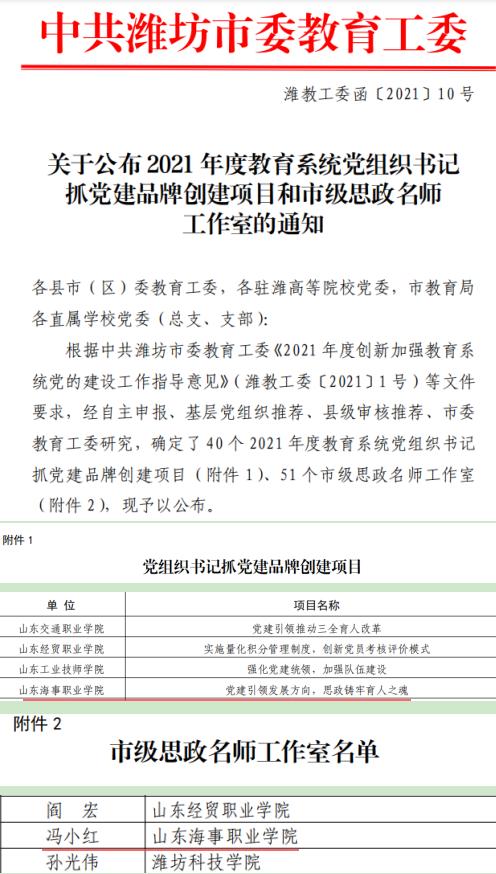 5月17日,根据中共潍坊市委教育工委发布的《关于公布 2021 年度教育系统党组织书记抓党建品牌创建项目和市级思政名师工作室的通知》,我校教学党支部书记冯小红申报的《党建引领发展方向,思政铸牢育人之魂》项目和思政名师工作室分别获批潍坊市2021年度教育系统党组织书记抓党建品牌创建项目和市级思政名师工作室。