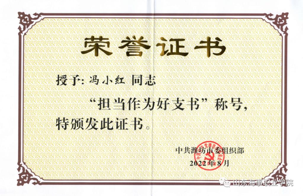 她,是马克思主义学院院长、教学党支部书记,她用爱心和责任培养了一批技术技能型高职人才,用奉献和担当影响了一批党员干部。她先后获得“潍坊市教育系统优秀共产党员”、“山东省教育系统优秀共产党员”“潍坊市优秀党务工作者”等荣誉称号。2022年被潍坊市委组织部评选为潍坊市“担当作为好支书”。