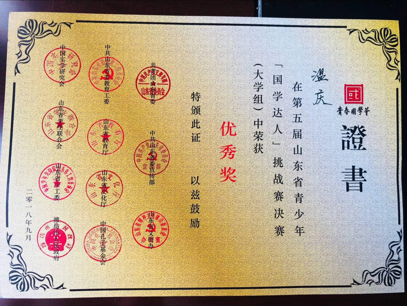 学院学子温庆获2018年齐鲁学子青春国学荟优秀奖