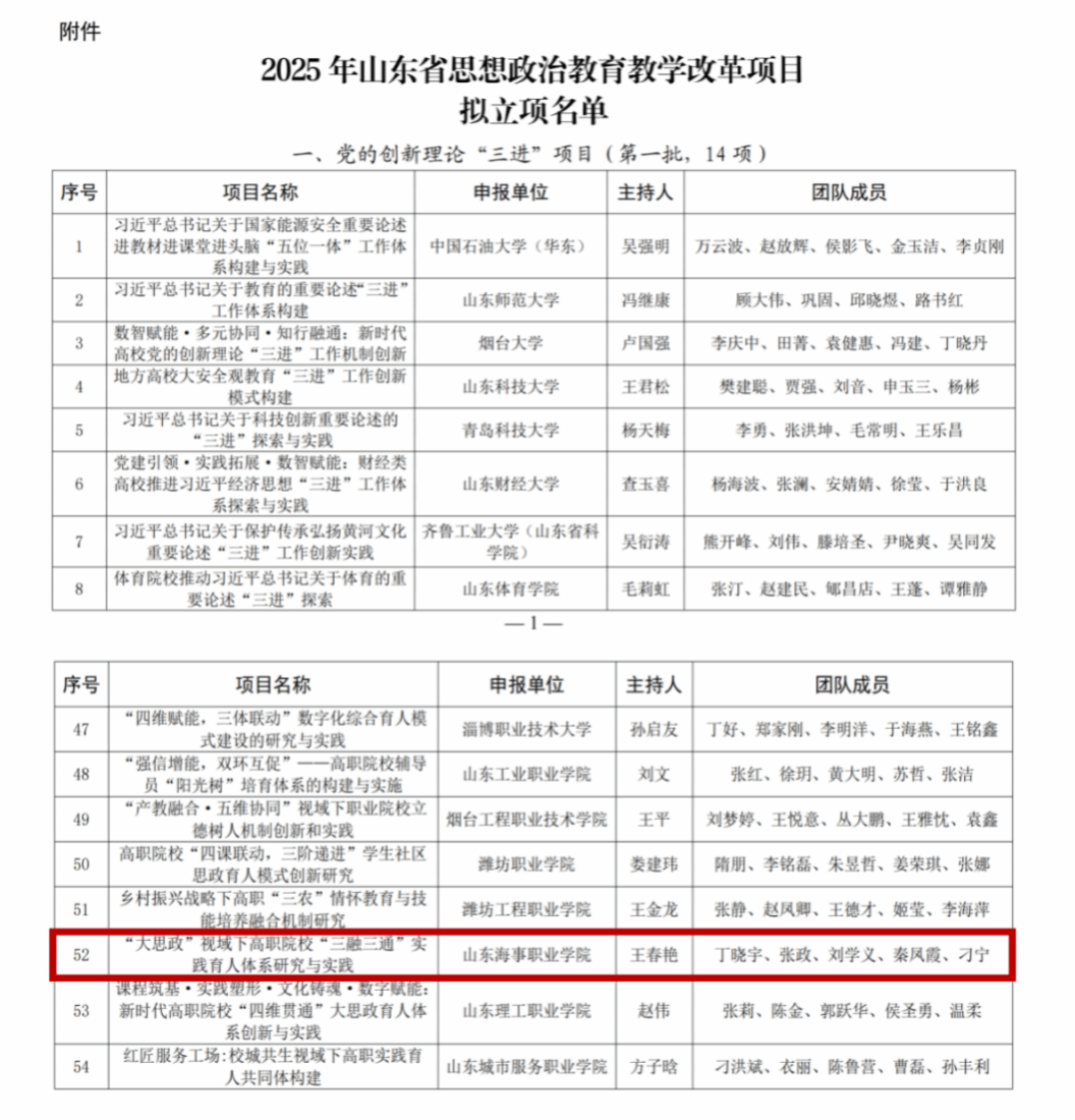 近日,山东省教育厅公布2025年山东省思想政治教育教学改革项目立项名单,我校申报的《“大思政”视域下高职院校“三融三通”实践育人体系研究与实践》成功获批立项。该项目聚焦新时代立德树人机制创新,是我校深化思政教育教学改革、推进思想政治工作体系创新的重要成果。