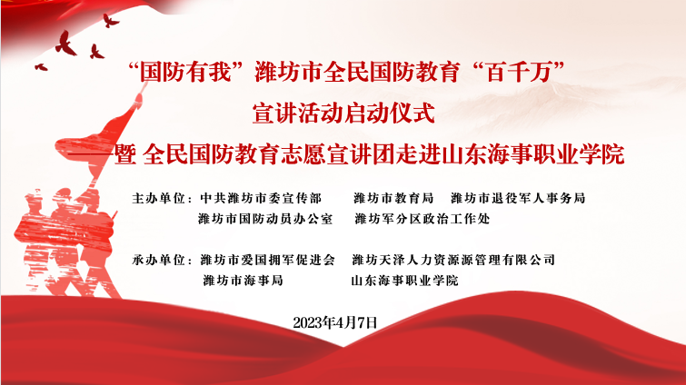 4月7日,“国防有我”潍坊市全民国防教育“百千万”宣讲活动启动仪式暨全民国防教育志愿宣讲团走进山东海事职业学院在我校举行。此次活动由潍坊市委宣传部、潍坊市教育局、退役军人事务局、潍坊市国防动员办公室、潍坊军分区政治工作处主办,由潍坊市爱国拥军促进会、潍坊天泽人力资源管理有限公司、潍坊海事局、山东海事职业学院承办。潍坊海事局局长柳强、潍坊军分区政治工作处主任韩富旺、潍坊市新时代文明实践中心主任路全东及市委宣传部、市教育局、市退役军人局、市国防动员办公室、潍坊海事局、潍坊军分区政治工作处和各县市区委宣传部有关领导出席活动。我校400余名师生代表共同参加活动。