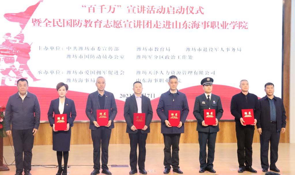 潍坊海事局、市退役军人局、市国防动员办公室、潍坊军分区政治工作处领导为潍坊市全民国防教育志愿宣讲团成员代表颁发聘书